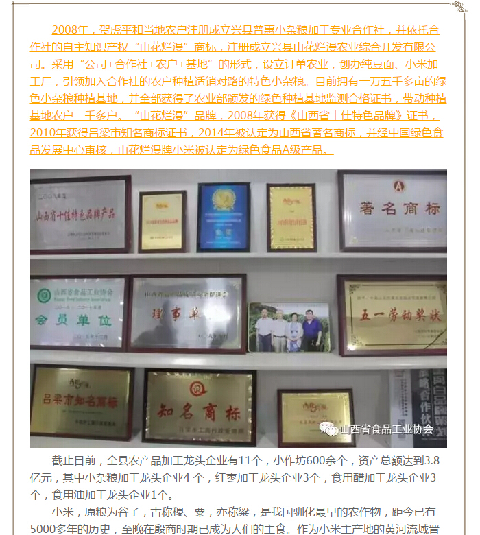 興縣山花爛漫農(nóng)業(yè)綜合開發(fā)有限公司是山西省農(nóng)業(yè)產(chǎn)業(yè)化重點龍頭企業(yè),公司成立于2008年,法人代表賀虎平,注冊資本1000 萬元,現(xiàn)有員工 30 人。